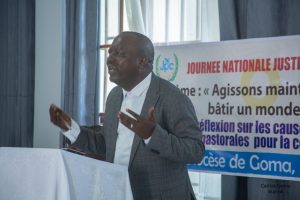 Le représentant de l’évêque du diocèse de Goma, Abbé Roland Mbayu, Coordonnateur du BDOM, a lancé un message important en s’alignant à celui de la CENCO affirmant que les chrétiens sont le sel de la terre et les bâtisseurs de la paix et doivent bannir toutes les barrières afin de vivre une justice sociale comme proposé le feu pape Paul VI (6), le créateur même de la commission Justice et Paix en 1967.